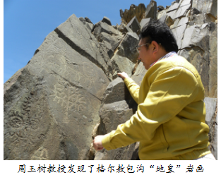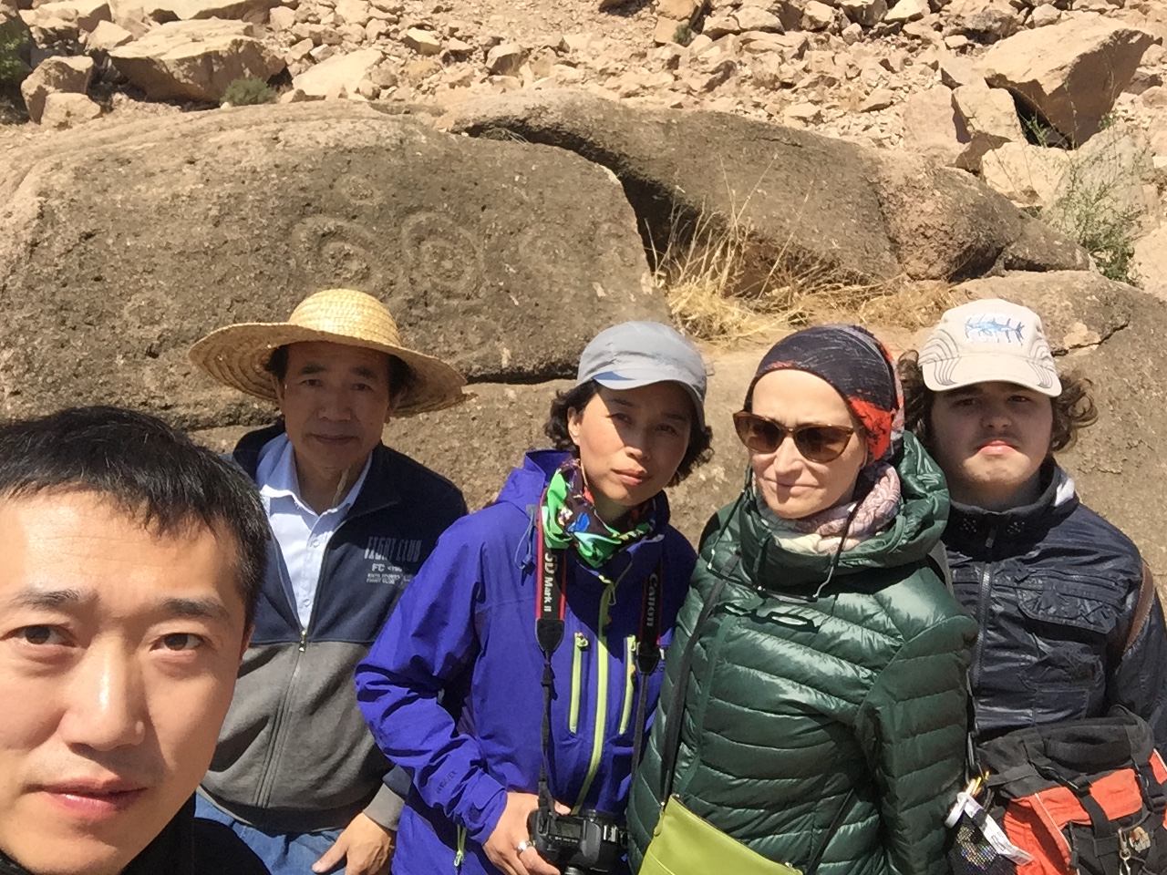 5月18日至21日,由周玉樹(shù)院長(zhǎng)帶隊(duì)吳甲才、陳國(guó)芳、黃俊峰參加的陰山三皇巖畫(huà)考察組,對(duì)默勒赫?qǐng)D高勒、格爾敖包溝、召燒溝巖畫(huà)進(jìn)行了為期四天的實(shí)地考察,此次考察收獲:一是重訪2014年5月周玉樹(shù)教授發(fā)現(xiàn)的三皇巖畫(huà),并對(duì)其進(jìn)行斷代研究,15米懸崖峭壁之上的三皇巖畫(huà)依然如故,但沒(méi)有找到可測(cè)年的石英晶體,第二天又重返此處,幸運(yùn)的是在三皇巖畫(huà)下找到了適合做測(cè)年的人面像巖畫(huà)樣本,通過(guò)三點(diǎn)石英晶體衰減因子科學(xué)測(cè)試、實(shí)驗(yàn)室反復(fù)驗(yàn)算,人面像巖畫(huà)制作年代距今在5460-6460年。二是在三皇附近西南發(fā)現(xiàn)了古人居住洞穴,洞中找到了古人石枕一塊和帶十字符號(hào)巖刻一塊(已送北大做沉淀物年代測(cè)試),應(yīng)該與制作巖畫(huà)有關(guān)。三是在第二和第三洞窟發(fā)現(xiàn)了舊石器晚期石鏟一枚和帶孔桃核55枚(已送北大做碳十四測(cè)年4枚)。四是此次考察的三皇資料,充實(shí)完善了“三皇研究館”文案。