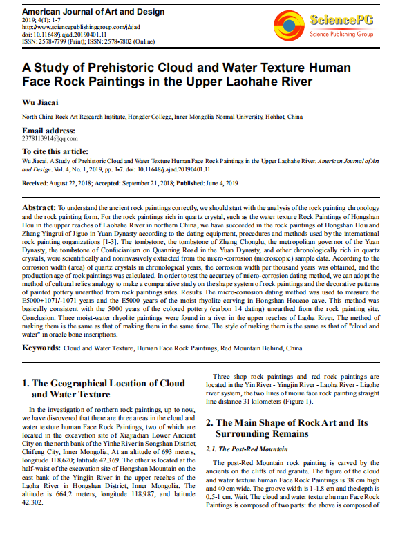 Wu Jiacai. A Study of Prehistoric Cloud and Water Texture Human Face Rock Paintings in the Upper Laohahe River. American Journal of Art