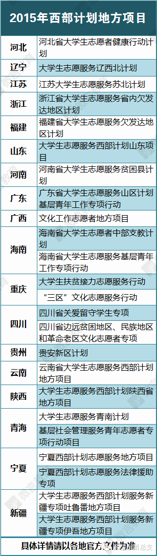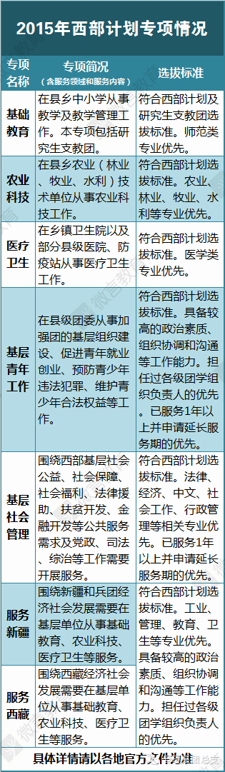 A2015年西部計劃全國項目繼續實施基礎教育、農業科技、醫療衛生、基層青年工作、基層社會管理、服務新疆、服務西藏等7個專項。