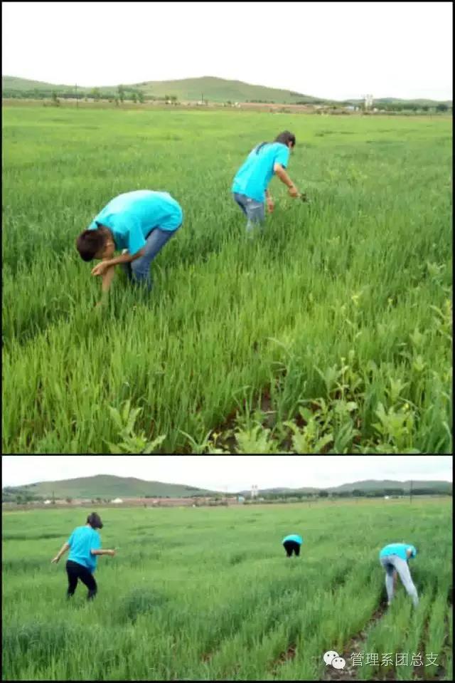 緊接著,該負責人告訴我們這家面粉廠已經建立了好幾十年了,并且為小分隊詳細的介紹了面粉的原料及制作過程。令小分隊更加驚喜的是,面粉的原料竟然是由面粉廠自己種植出來的。隨后,我們跟著負責人到了第二個大院兒里,那里簡直就是面粉的種植基地,放眼望去,綠油油的一片。那里種著制作白面的小麥、莜面的主要原料莜麥,甚至還有胡麻油的原料亞麻籽。小隊一行人在得到負責人的許可,一個個按耐不住的跑到田地里,幫忙除掉雜草。小分隊一行人忙活了一上午,打算爭取把野草全部拔掉。可是美好的愿望被下午的一場大雨摧毀了,只好放棄了這個想法,打道回府.