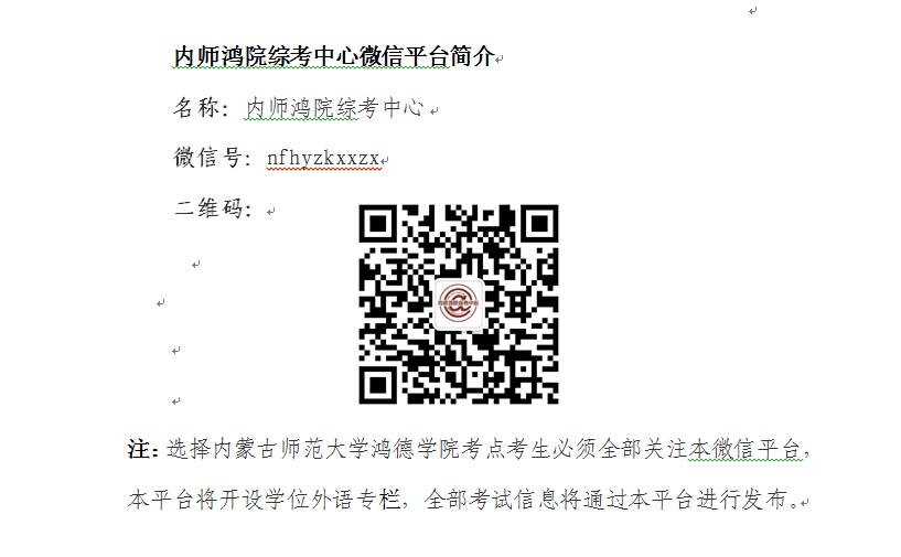 5、以上通知事宜均已通過報名網站進行提示、內蒙古師范大學鴻德學院教務處網站、【內師鴻院綜考中心】微信平臺進行通知。選擇內蒙古師范大學鴻德學院考點參加考試的考生請務必關注【內師鴻院綜考中心】微信平臺,隨時關注考點發出的相關通知,確??荚図樌M行。