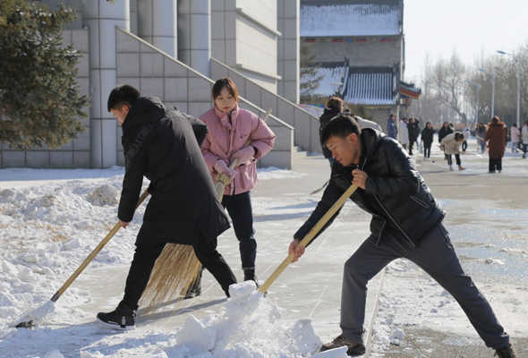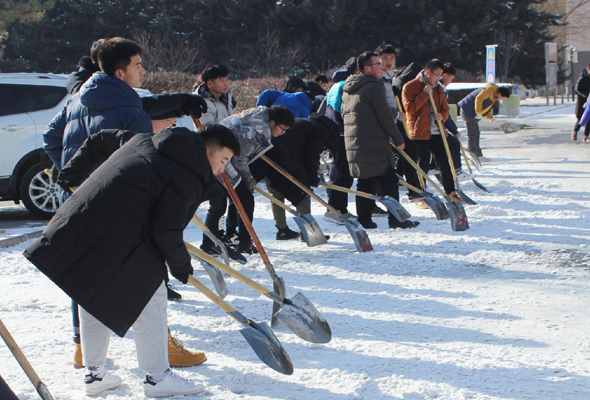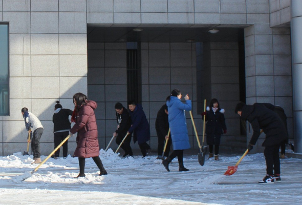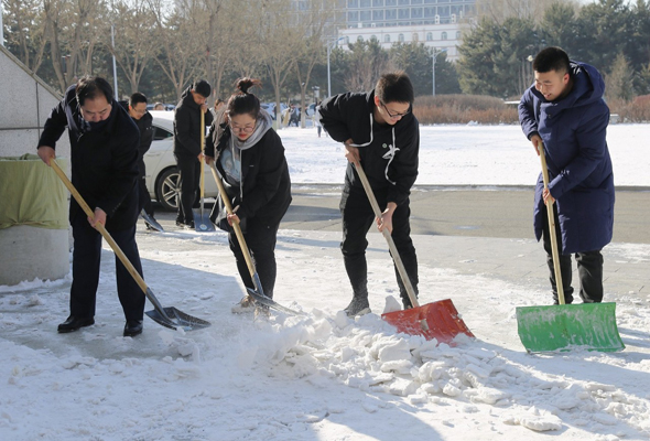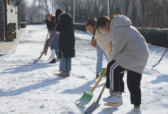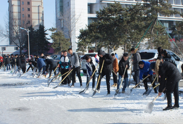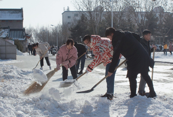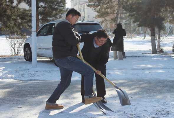 中午12:30,師生們帶著鏟雪工具在崇德樓前集合,分工之后便積極投入到鏟雪活動中。大家手拿掃帚和鐵鍬,冒著嚴寒,齊心協力,經過近兩個小時的努力,校園主干道的積雪基本被清理完畢,師生們通行方便了很多。