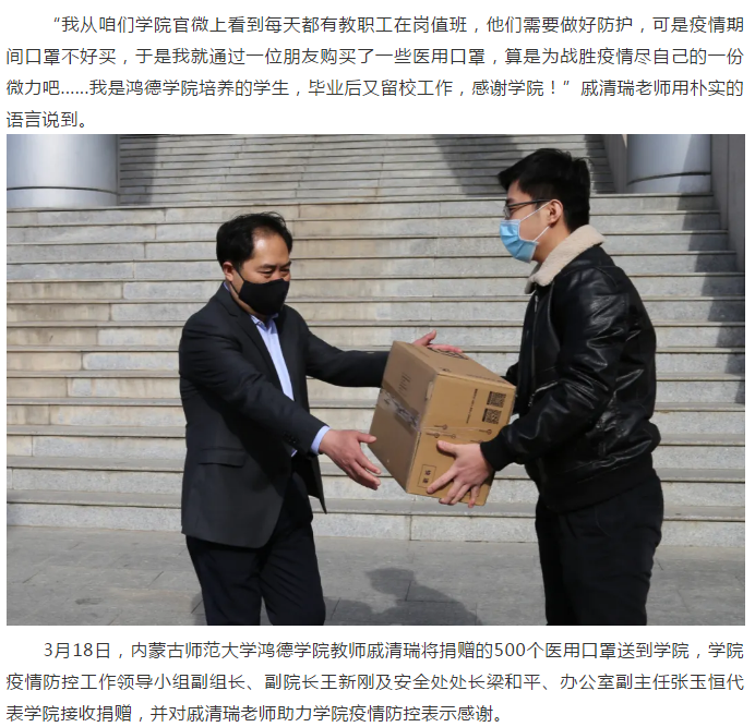 內師大鴻德學院畢業留校工作教師戚清瑞向母校捐贈醫用口罩