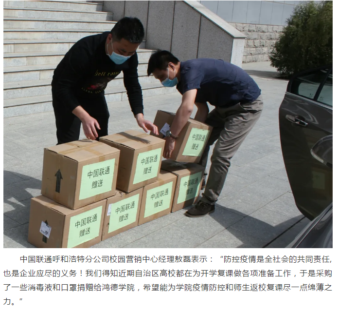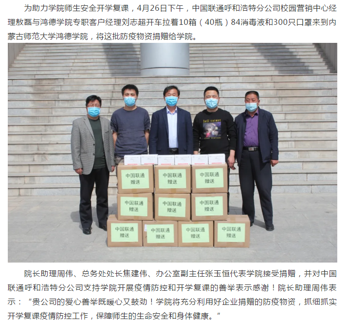 中國聯通呼和浩特分公司向內師大鴻德學院捐贈防疫物資
