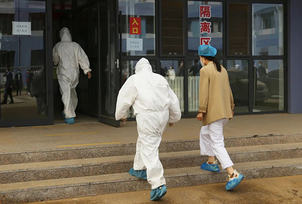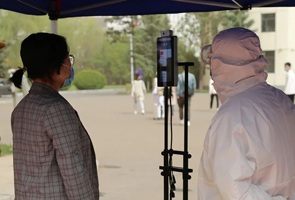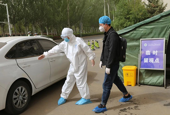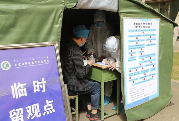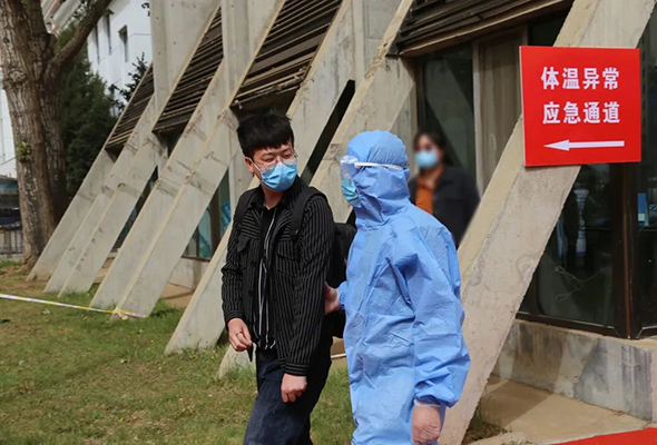在宿舍,一名學生出現發熱癥狀,本人和宿舍同學立即打電話報告班主任和學院防疫值班人員。聞訊趕來的防疫人員立即對學生進行體溫檢測和防疫處置,之后將發熱學生帶至隔離區做進一步診斷。