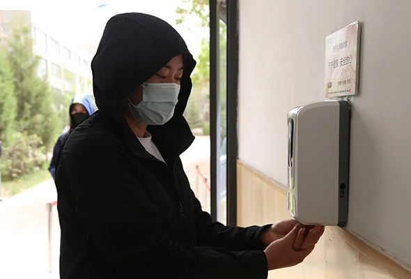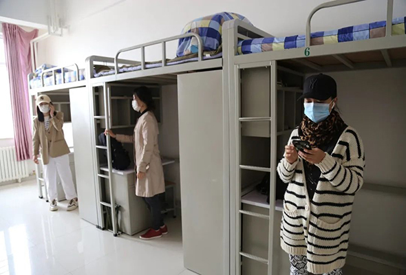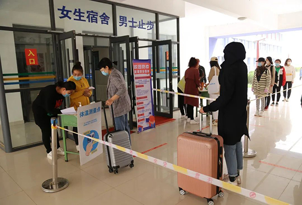入校學生陸續從校門口進入宿舍區,在每棟宿舍樓門口要再次進行身份核驗和體溫測量,體溫正常者方可進入宿舍樓。