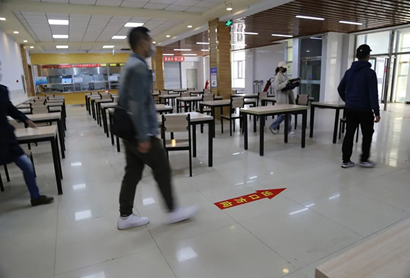 餐廳外設置了等候區,進入餐廳后要先洗手消毒,然后沿地面標示線到打餐窗口。就餐時要一人一桌、同向就坐。學院建議同學們打包帶回宿舍食用,盡量減少在餐廳停留的時間。就餐完的同學要按照地標指示,從出口處走出餐廳。