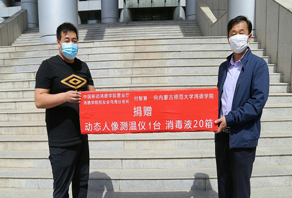 5月19日,內蒙古師范大學鴻德學院2008級校友付智慧將1臺動態人像測溫儀和20箱消毒液捐贈給學院,助力母校開學疫情防控工作。院長助理周偉、安全處處長梁和平、總務處處長焦建偉和辦公室副主任張玉恒代表學院接收捐贈,并向付智慧送上感謝信。
