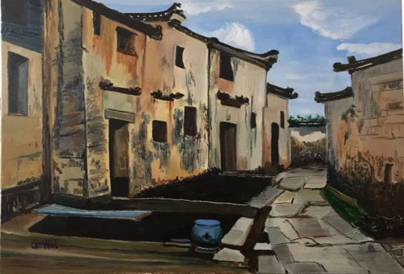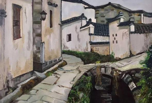 西遞,位于黃山南麓,高聳的山脈和平坦的田原共同圍筑起這個美麗的村莊,數百幢徽派古民居保留了明清村落的基本面貌和特征。這里素有“桃花源里人家”之稱,皖南的靈動和秀麗在西遞的山水中得到了充分的體現。藝術系的學生們在老師的指導下,以徽派建筑為主要創作參照,完成了400余幅油畫、國畫作品。學生作品構圖嚴謹、色彩生動,極富意境。