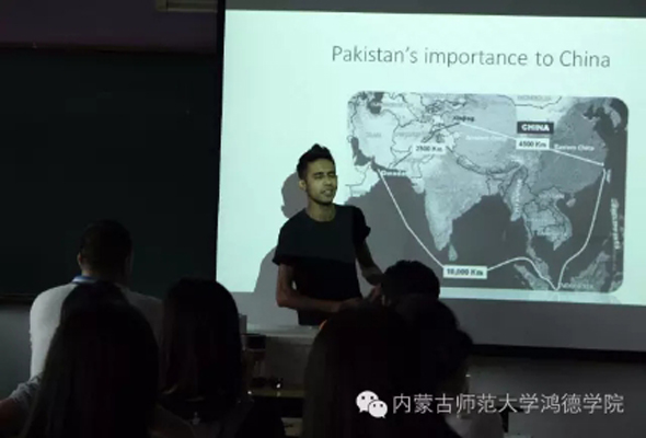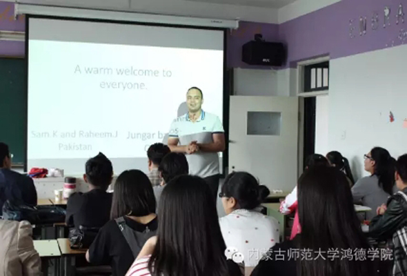 阿卜杜爾?薩瑪?shù)?汗先生(Abdul Samad Khan),巴基斯坦人, 英國威爾士格林多大學(xué)工商管理碩士,曾擔任巴基斯坦白沙瓦TAmeer-e-Seerat 學(xué)校管理主任,伊斯蘭堡TRG客戶代表,英國利物浦安特里賽場經(jīng)理,金融分析專員,英國莫瑞森公司直線經(jīng)理,現(xiàn)任鄂爾多斯迷你倫敦學(xué)校主任。由于今天是巴基斯坦的國防日,阿卜杜爾?薩瑪?shù)?汗先生在講座的開始便提到國防對于一個國家的重要性:“國防對于每個國家都很重要,只有國防軍事提高了,我們才能在一個安全的環(huán)境下生活”。阿卜杜爾?薩瑪?shù)?汗先生也用史實與圖片生動的向同學(xué)們解釋了中巴關(guān)系交好的原因以及為何將今日定為巴基斯坦國防日的原因和意義。阿卜杜爾?薩瑪?shù)?汗先生說,自1947年開始,中巴關(guān)系開始密切,他用激昂的語氣鼓勵同學(xué)們:“無論東方和西方,我們都是最好的。無論我們做什么,我們都應(yīng)該想到積極的一面”。