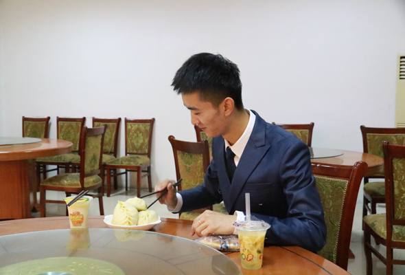 早操結束后,“一日院長”祁文強來到食堂開始用餐。他也提示同學們一定要注重早餐的重要性,保證早餐營養的攝入,才能一天活力滿滿。
