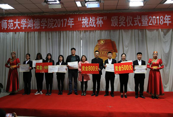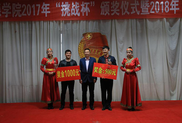 為進一步培養學生的創新意識,樹立創業精神,提高實踐能力, 4月10日下午6:00,內蒙古師范大學鴻德學院2017年“挑戰杯”頒獎儀式暨2018年“挑戰杯”啟動儀式在圖書館五樓報告廳舉行。出席本次活動的有招生就業處處長張振龍、財會系黨支部書記韓曉軍、學生處生活管理科白曉童、院團委副書記馬明亮,以及各系(分院)團總支書記出席了此次活動。各系(分院)認真評選與推薦后,選出了20件作品上報自治區參加比賽,最終獲得自治區二等獎一件,獲得自治區三等獎5件。獲得院級獎項的作品6件,分別為院級一等獎1件,院級二等獎2件,院級三等獎3件。2017年度挑戰杯競賽中藝術系獲得院級“挑戰杯”獎,財會系獲得院級“挑戰杯”優秀組織獎。我院財會系李鯤老師獲得自治區優秀指導教師稱號,科研處琪根老師獲得院級優秀指導教師稱號。