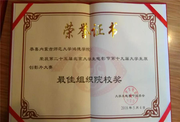 今天,繼去年之后又一次摘得了北京大學(xué)生電影節(jié)最佳組織院校獎(jiǎng),再次蟬聯(lián)這一殊榮,體現(xiàn)出了我院廣播電視編導(dǎo)專(zhuān)業(yè)在學(xué)生專(zhuān)業(yè)人才培養(yǎng)方面的顯著成果。此次獲獎(jiǎng)極大地調(diào)動(dòng)了學(xué)生的積極性,也將大大提升內(nèi)蒙古師范大學(xué)鴻德學(xué)院在全國(guó)影視類(lèi)院校中的影響力和美譽(yù)度。