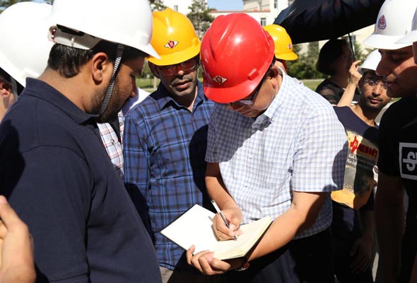 周院長帶巴基斯坦留學生來到致遠樓北側的足球場訓練學校項目的施工現場,這是留學生們第一次親身體驗中國的施工現場。在前往工地的途中,周院長親切地與留學生們交談,向留學生們介紹了關于致遠樓的房屋構建、房屋成本以及相關的項目費用等等,留學生們提出了很多專業性的問題,周院長一一為其解答。在接受過簡單的安全培訓后,留學生們井然有序地進入施工現場。