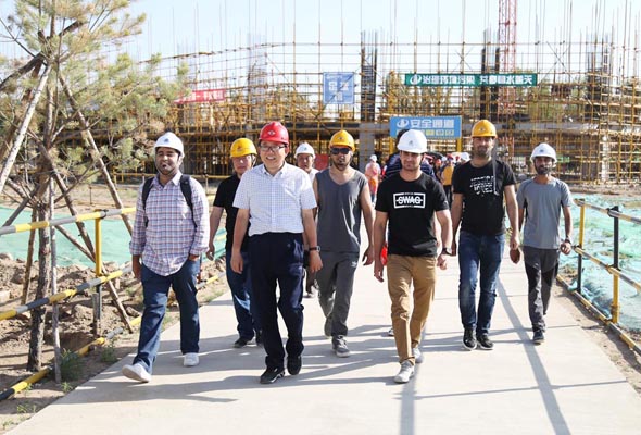 留學生們小心穿梭在鋼筋混凝土組成的施工架構中,緊跟著周院長、老師和工人師傅的步伐,聆聽周院長的講授,目光也時時隨著周院長所講授的地方而移動。雖然語言不同,但這并不能影響留學生們對學習的積極與熱情。周院長和留學生們談道:四十年前中國的經濟遠遠不及巴基斯坦的經濟,然而在短短的四十年里,中國的經濟快速發展,并且超過巴基斯坦。中國經濟之所以飛速發展,正是因為中國人有著奮發圖強、鍥而不舍的精神。周院長對留學生抱以殷切希望,希望他們在學習上也要有奮發圖強的精神,刻苦鉆研學術,從而創造佳績。隨后在參觀學習施工現場途中,遇到很多忙碌在工作崗位上的女性工人,周院長對留學生們講到,中國男女的地位是平等的,沒有什么職業要對性別有限制。留學生們聽后紛紛點頭表示贊同