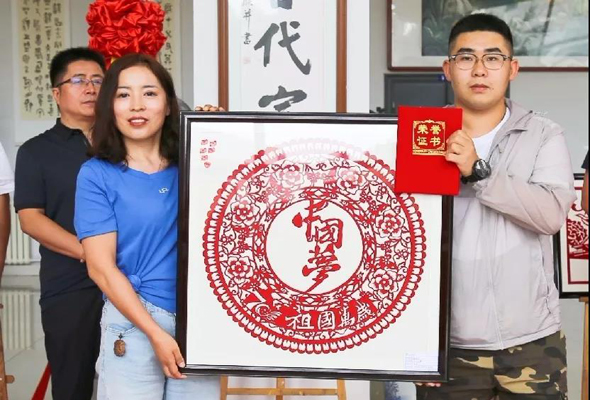 開幕式結束后,開展了優(yōu)秀作品評比活動,參觀者用現場投票的方式評選出了優(yōu)秀作品。蘆一帆的作品《我和我的祖國》榮獲一等獎,王曦田的作品《心中的太陽》榮獲二等獎,銀艷兵的作品《中國夢》榮獲三等獎。非遺傳承人崔霞、學院黨委書記盧鳳龍、辦公室主任張玉恒為獲獎學生頒獎。
