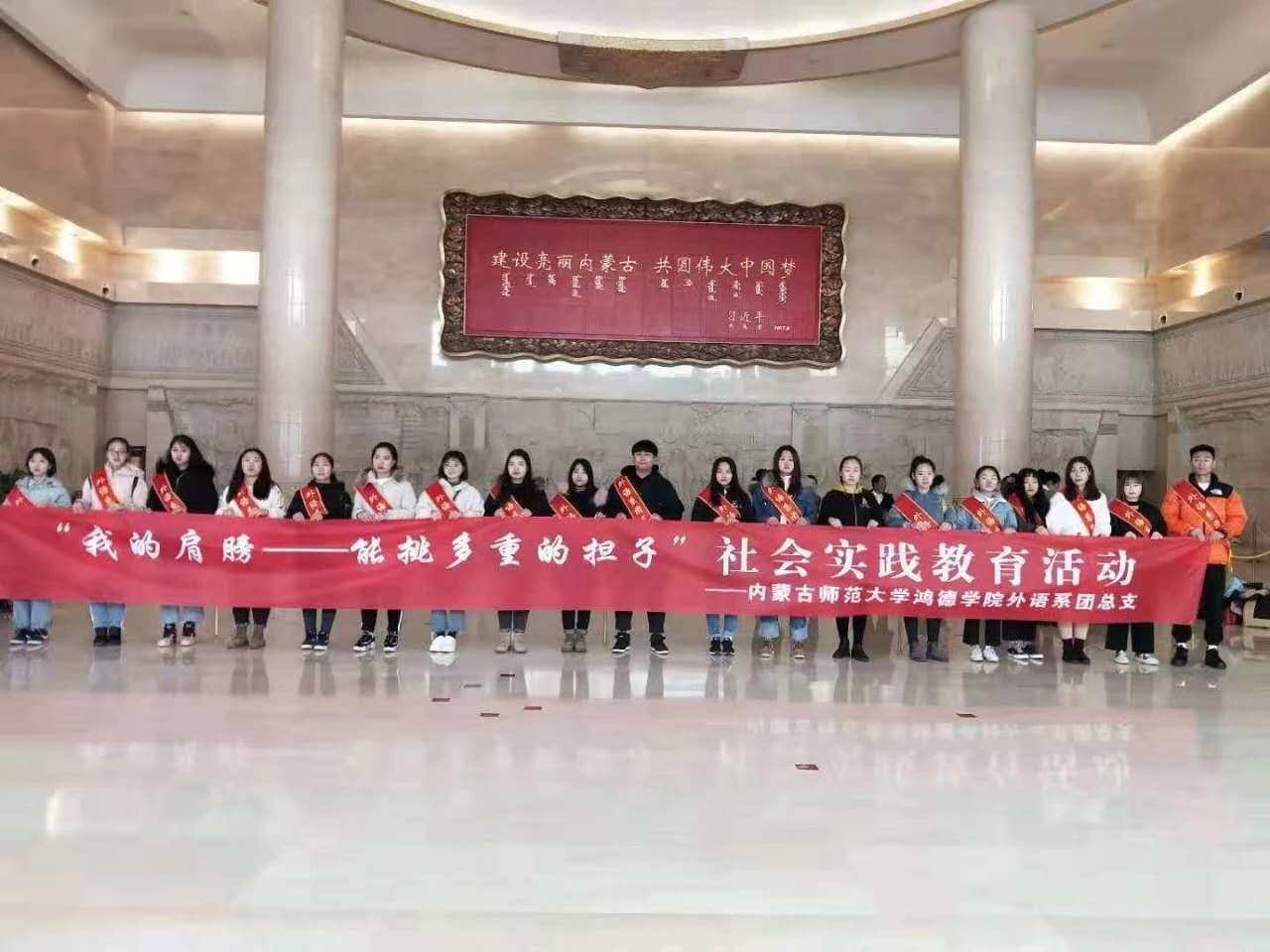 為了踐行社會主義核心價值觀,深入貫徹黨的十九大精神,全面貫徹落實習近平總書記在全國宣傳思想工作會議和全國教育大會上的重要講話精神,同時深入貫徹落實全區宣傳思想工作會議精神,內蒙古師范大學鴻德學院外語系團總支于2018年12月2日,開展了“我的肩膀——能挑多重的擔子”社會實踐之走進內蒙古博物館活動。