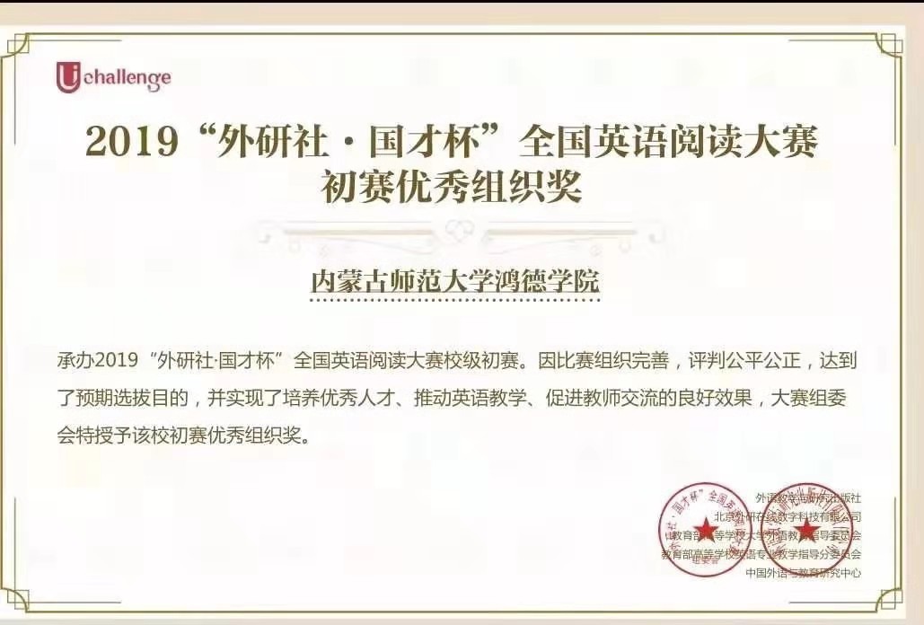 內(nèi)蒙古師范大學(xué)鴻德學(xué)院獲得2019“外研社·國才杯”全國英語閱讀大賽初賽優(yōu)秀組織獎(jiǎng)。