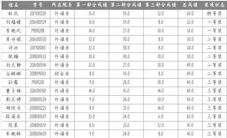 本次賽事由外語系基礎(chǔ)教研室主任蔡文斌、公共外語教研室副主任張國良策劃。賽事考場(chǎng)設(shè)置于崇德樓一樓機(jī)房。本次參賽同學(xué)共有54人。參賽者分別來自外語系、經(jīng)濟(jì)管理系、財(cái)會(huì)系、人文系16、17、18級(jí)。