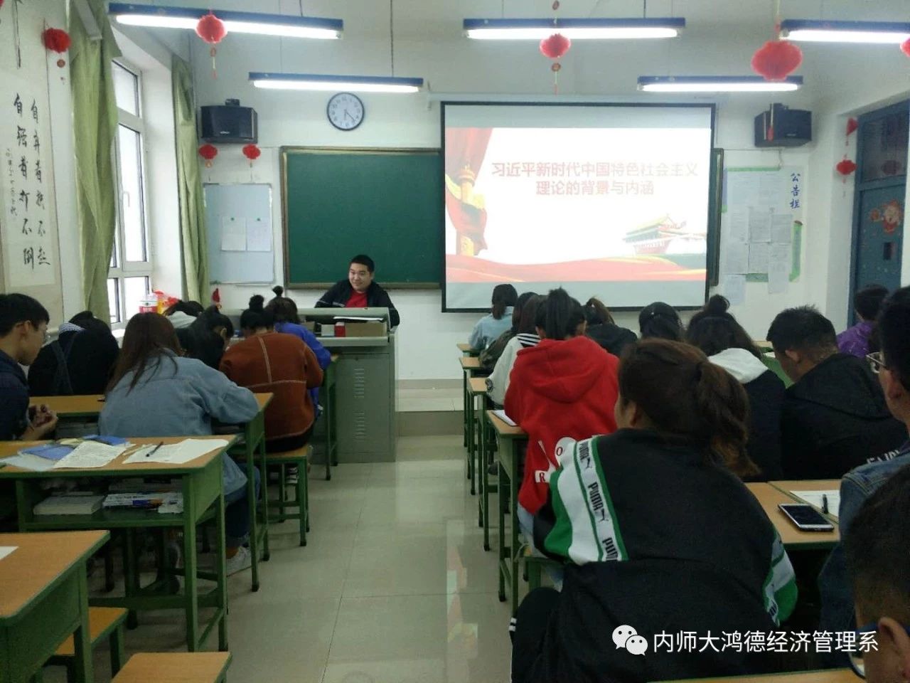 彭兆強老師從十九大報告主題、習近平新時代中國特色社會主義思想內容中8個明確和14個堅持、中國特色社會主義新征程生動的剖析了十九大精神,并結合我院實際情況,對十九大報告中教育方面做了闡釋。