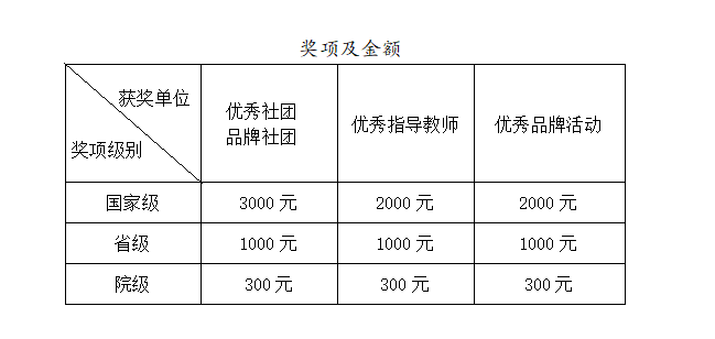 根據社團獲獎情況將以國家級、省級、院級三類獲獎級別給予獎項,如獲多個獎項,將按最高獎項頒發。具體獎項及金額如下: